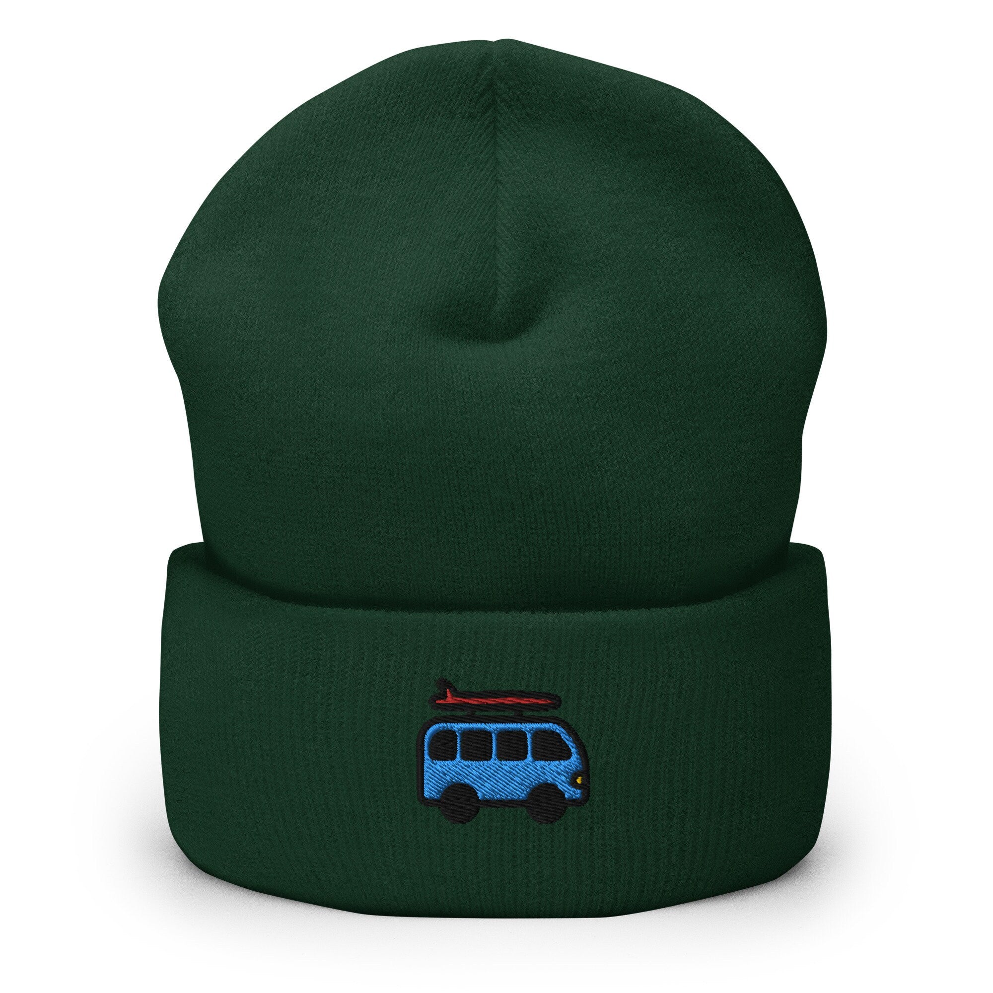 Backpacking Hippie Boho Camper Surfboard Van Embroidered Beanie, Handmade Cuffed Knit Unisex Slouchy Adult Winter Hat Cap Gift