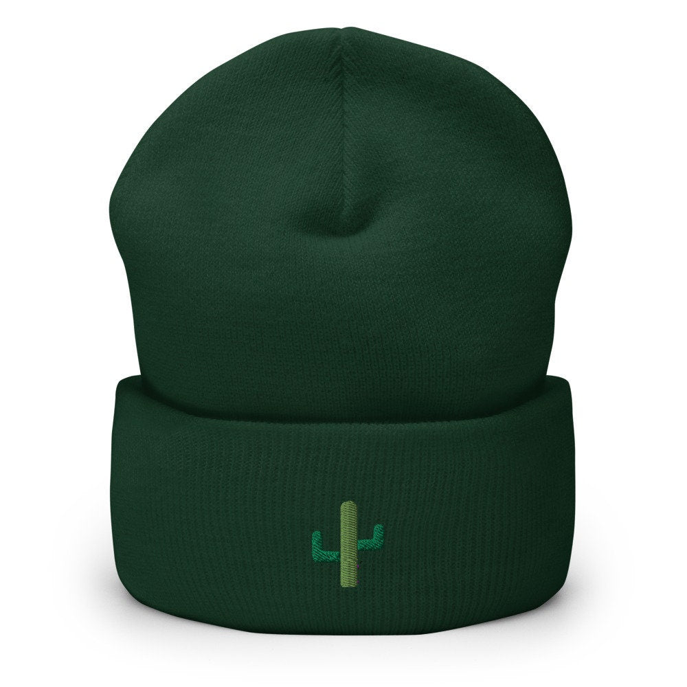 Cactus Embroidered Beanie, Handmade Cuffed Knit Unisex Slouchy Adult Winter Hat Cap Gift