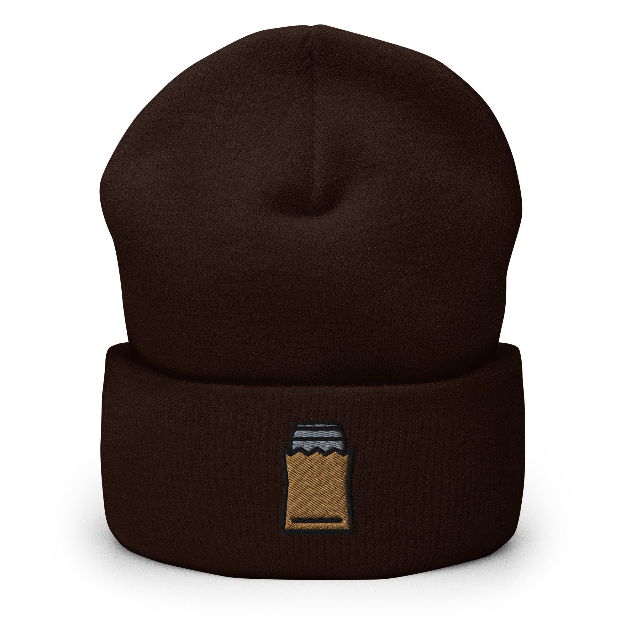 Can of Beer Brown Paper Bag Embroidered Beanie, Handmade Cuffed Knit Unisex Slouchy Adult Winter Hat Cap Gift