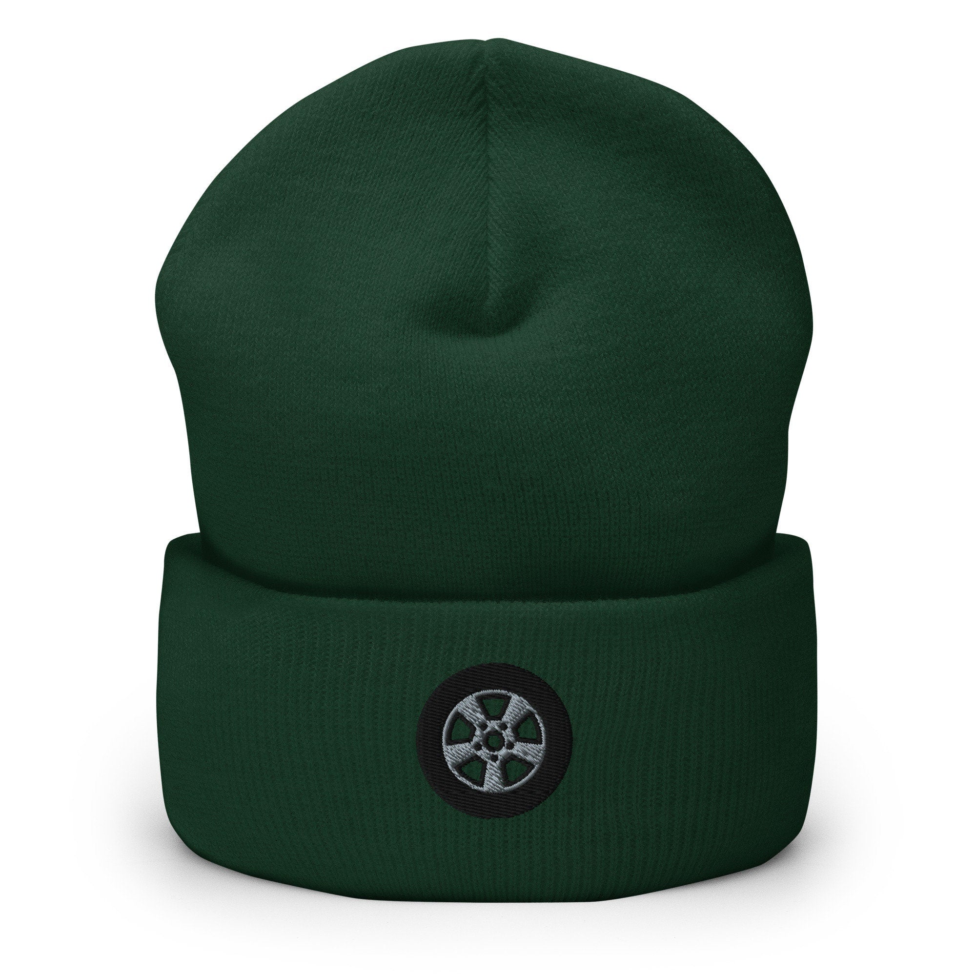 Car Tire Embroidered Beanie, Handmade Cuffed Knit Unisex Slouchy Adult Winter Hat Cap Gift