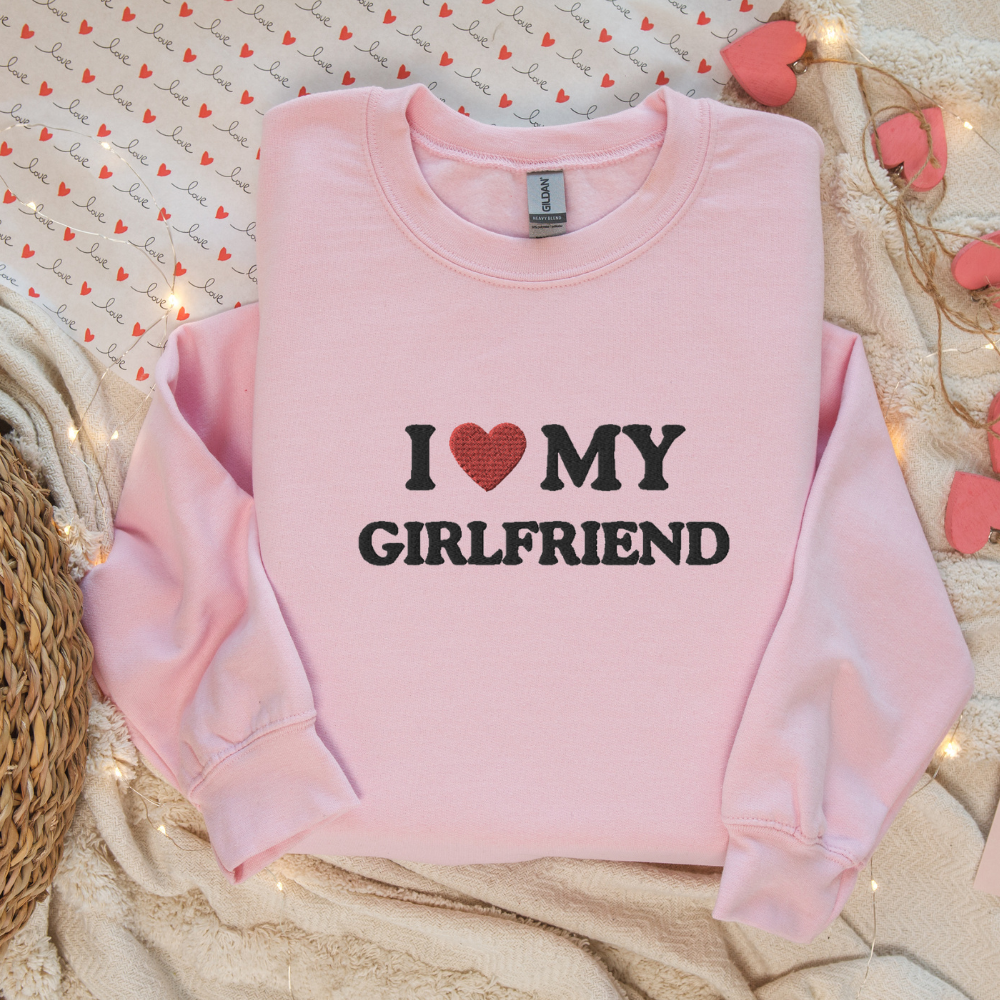 Embroidered I Love My Girlfriend, I Heart My Girlfriend,Sweatshirt, Funny Crewneck Sweater Gift for Her, Him