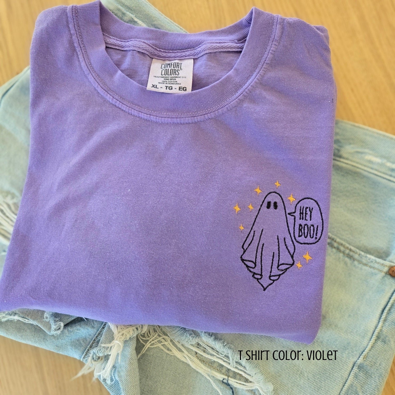 Hey Boo! ghost tee. Pre shrunk and garment dyed, these shirts get softer as you wash and wear them and last a lifetime! These have a vintage look and a lived in feel! Choose from many t-shirt and thread colors! Care Instructions: Machine wash cold gentle cycle. Tumble dry low. No bleach.
