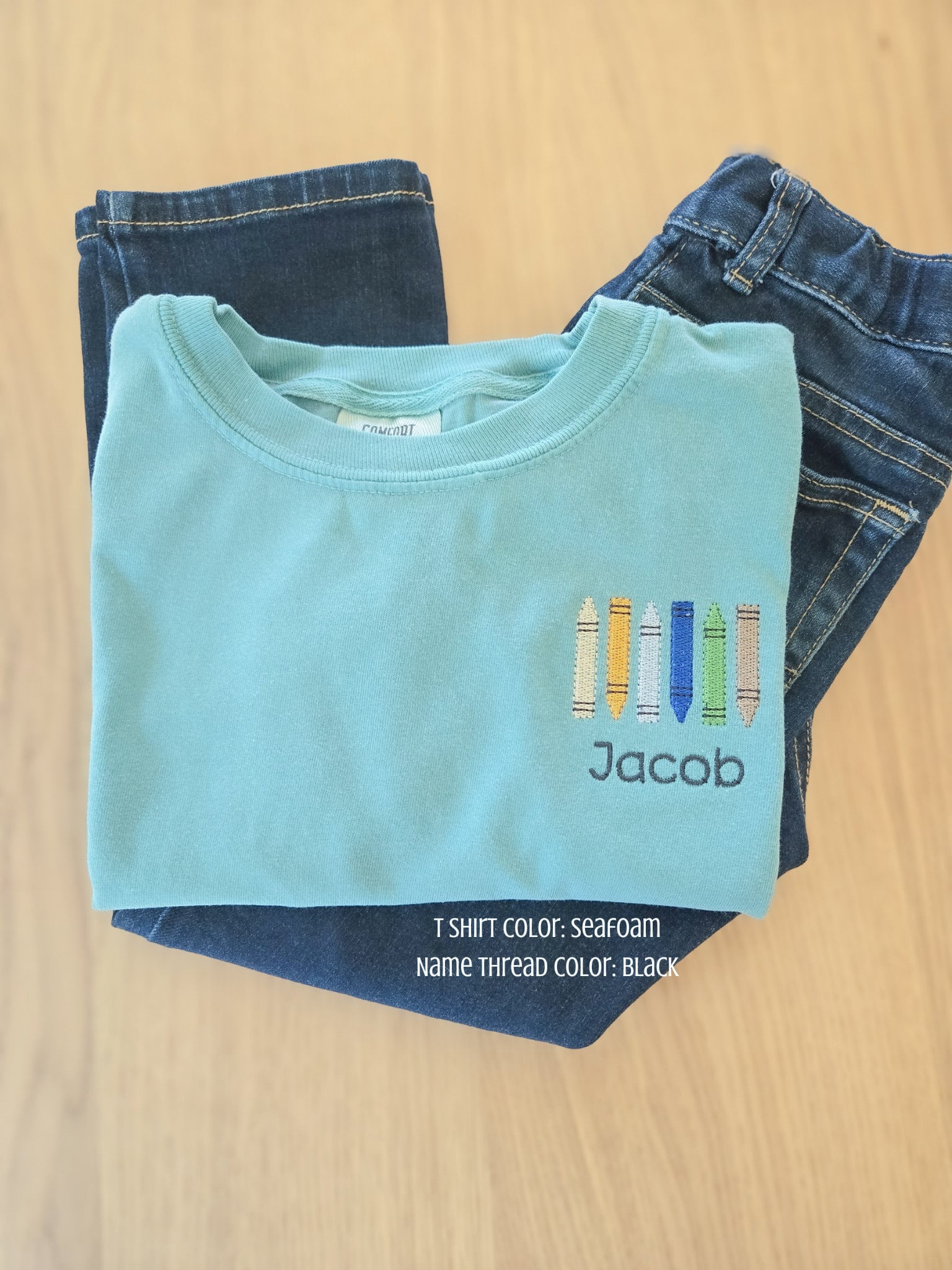 Comfort Colors T-Shirts for kids! Great t shirts for back to school! Embroidered crayons personalized with 1 name. Choose from many different fonts and thread colors for the name. If interested in size XXS (fits like a 3T) please message me to check inventory as the stock for that size is super limited. Pre shrunk and garment dyed, these shirts get softer as you wash and wear them and last a lifetime! These have a vintage look and a lived in feel! Dont see a color or font you want? Message us and we will be happy to create a custom order for you! Care Instructions: Machine wash cold gentle cycle. Lay flat to dry recommended. No bleach.