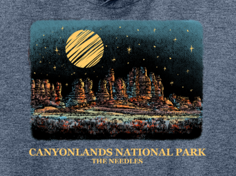 Immerse yourself in the stunning beauty of the night sky with our Canyonlands Needles Night Sky Hooded T-Shirt in Navy Frost. This stylish long sleeve tee, perfect for outdoor excursions, is crafted from a comfortable and durable blend of 50% polyester, 25% cotton, and 25% rayon. Featuring a mesmerizing night sky design, this hooded tee offers both protection and style. Machine washable for easy maintenance. Explore the outdoors in ultimate comfort and elegance with this unique hooded shirt.