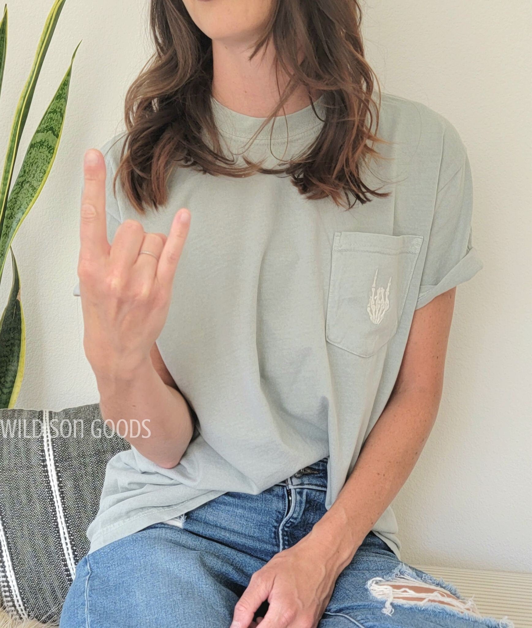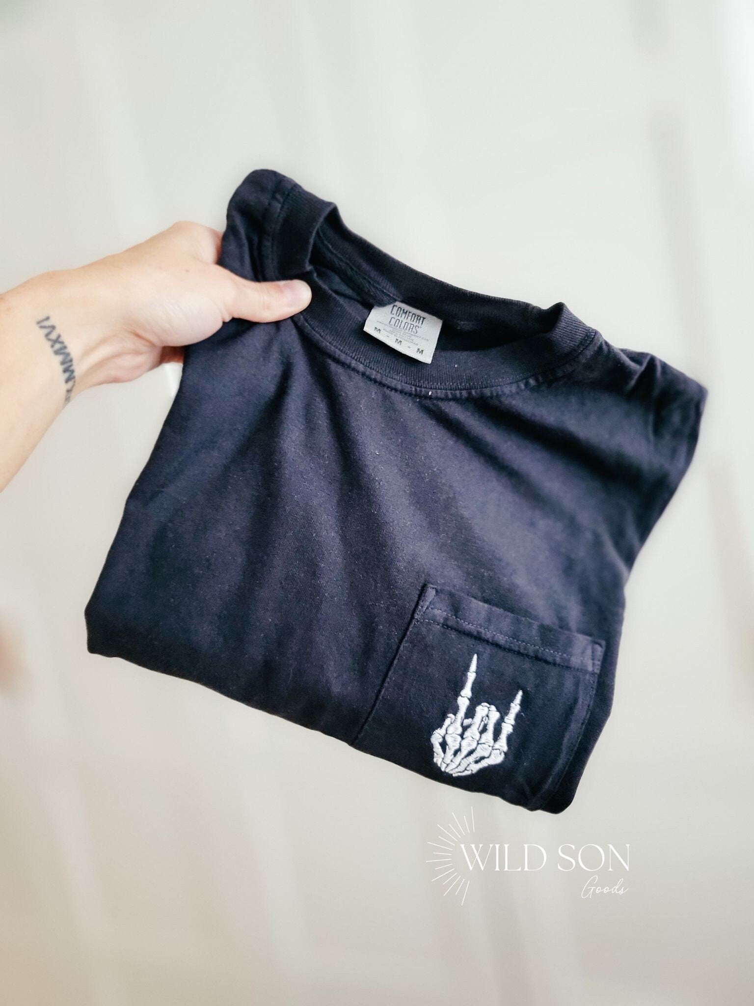 Rock n Roll skeleton hand t shirt. Embroidered onto a comfortable comfort colors pocketed t shirt. With this design please keep in mind that the pocket will not be functional and it will be sewn shut. If interested on something else, please message us and we will be happy to create a custom order for you! Care Instructions: Machine wash cold gentle cycle. Tumble dry low. No bleach.