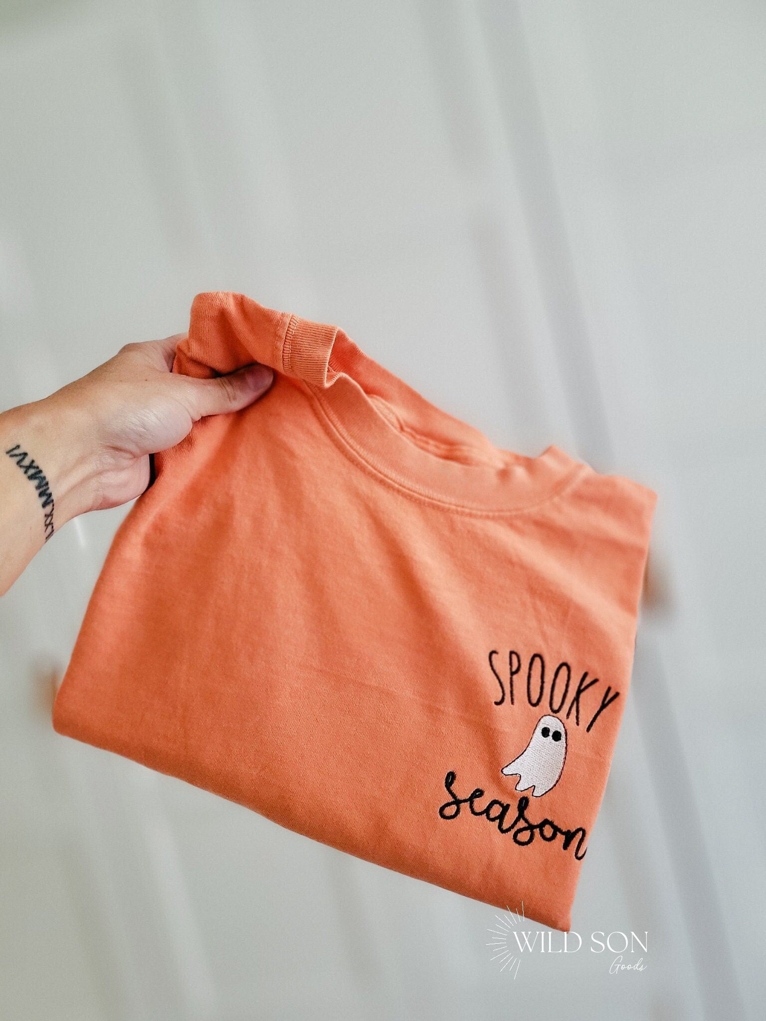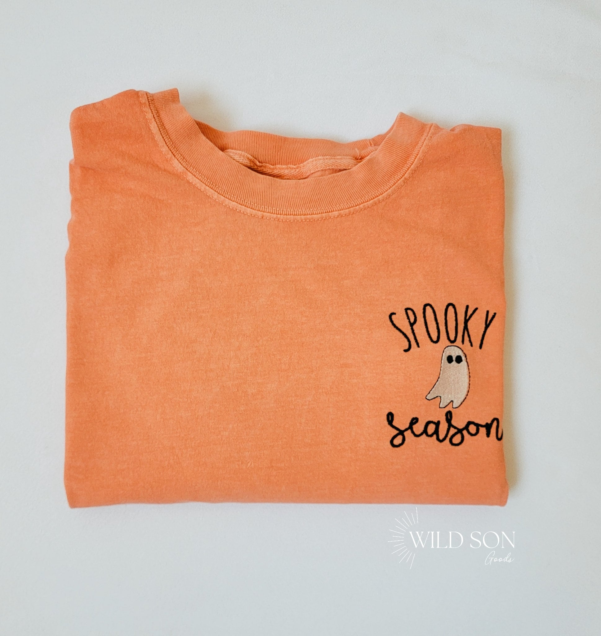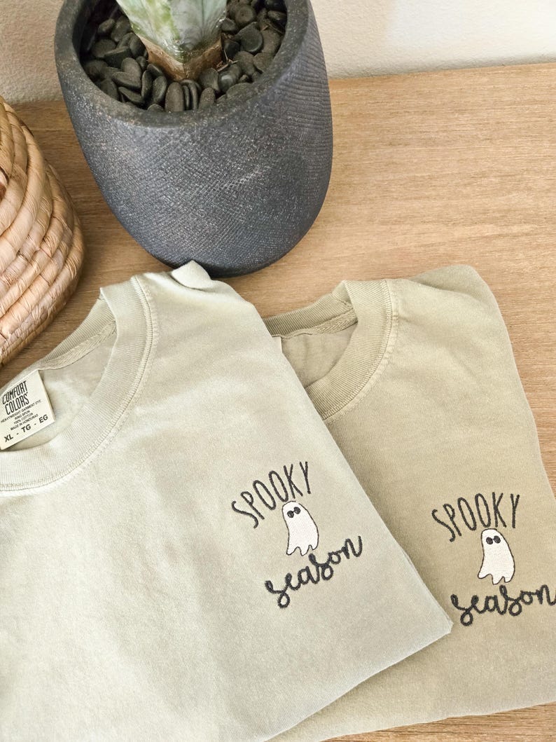 Spooky Season tee with a cute little ghost. Pre shrunk and garment dyed, these shirts get softer as you wash and wear them and last a lifetime! These have a vintage look and a lived in feel! Choose from many t-shirt and thread colors! Care Instructions: Machine wash cold gentle cycle. Tumble dry low. No bleach.