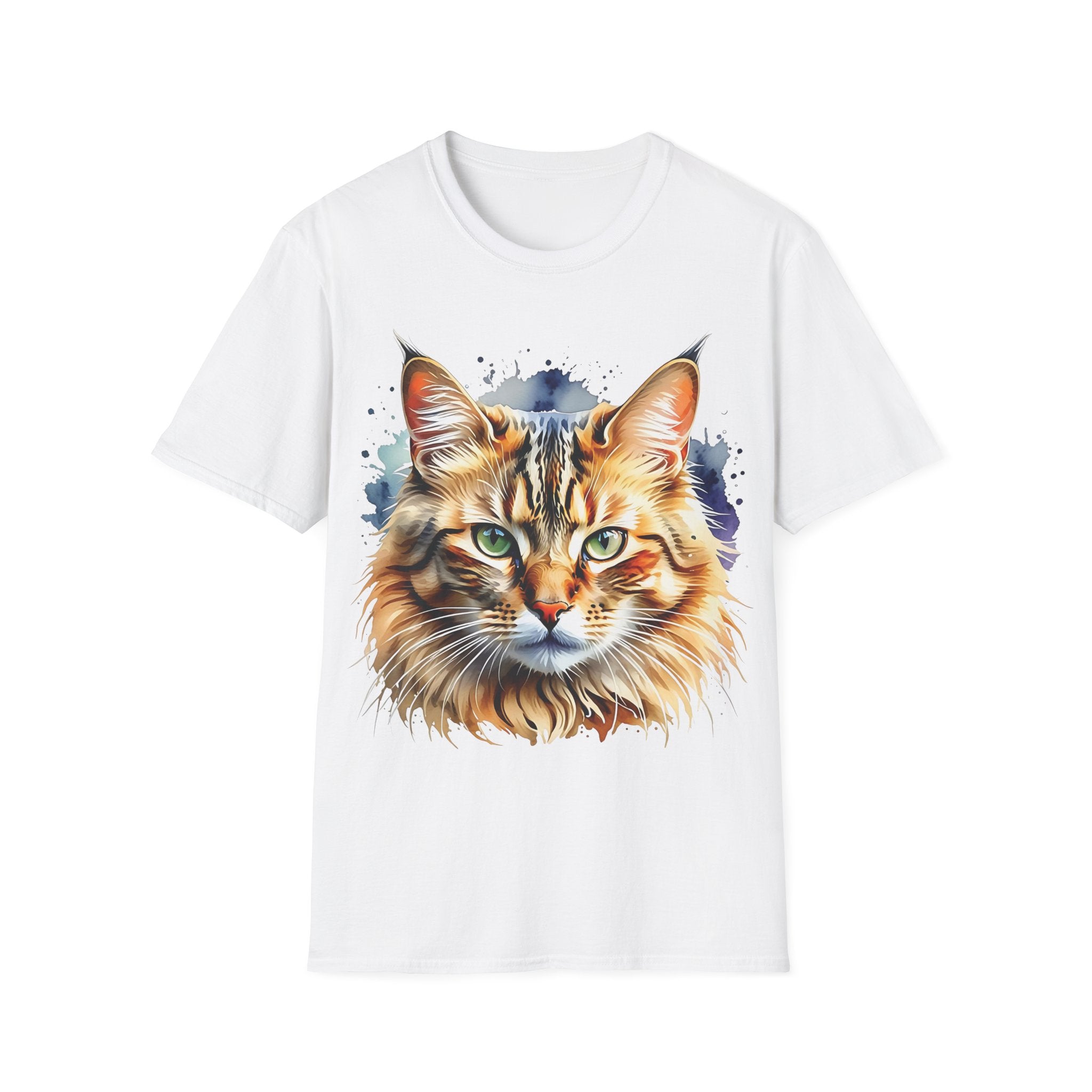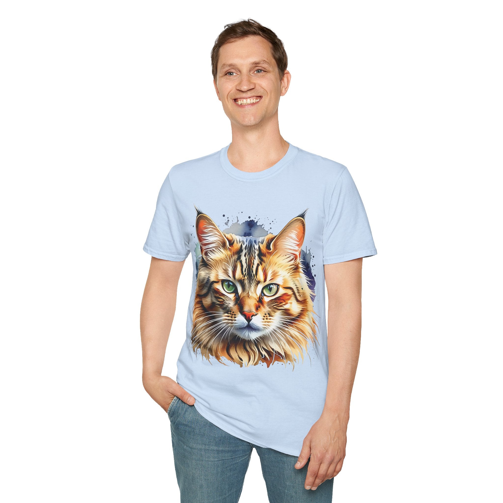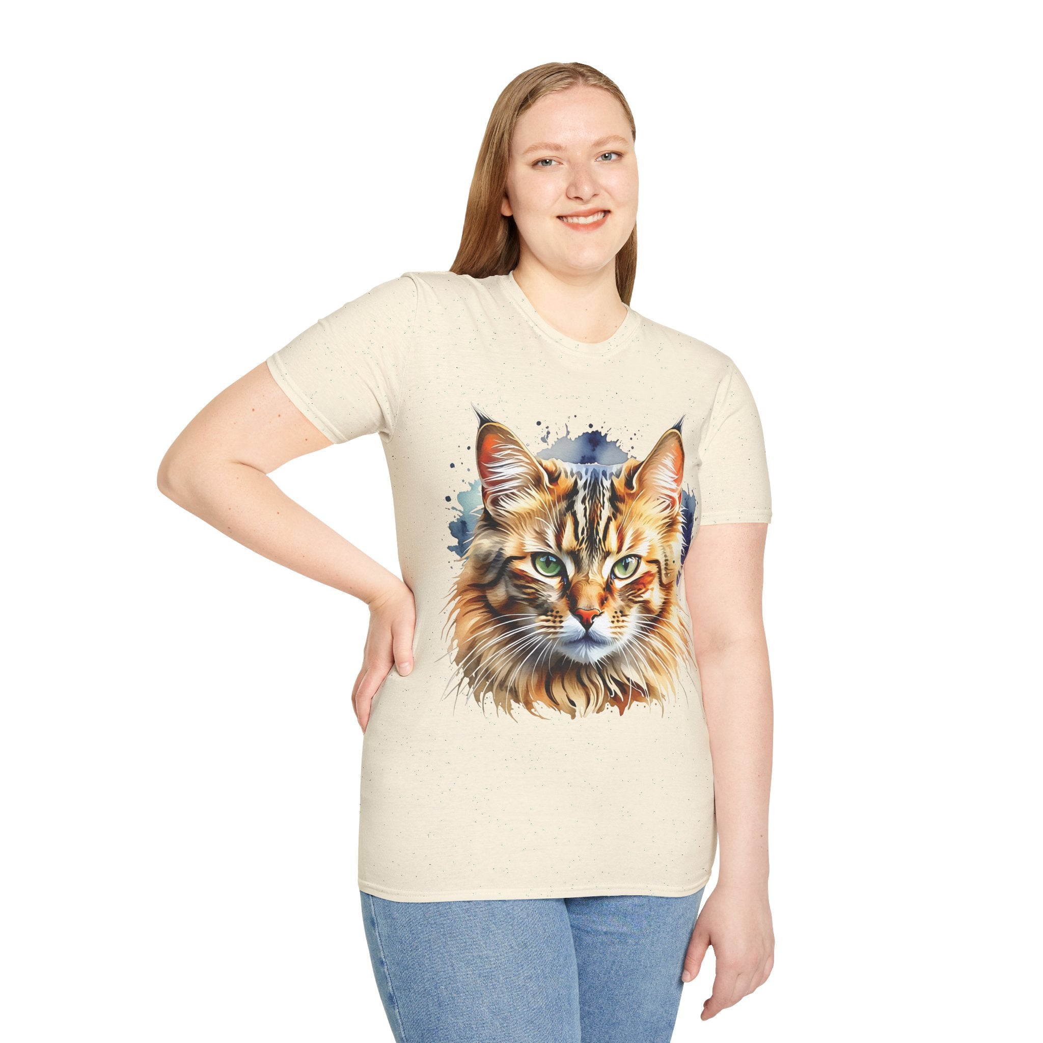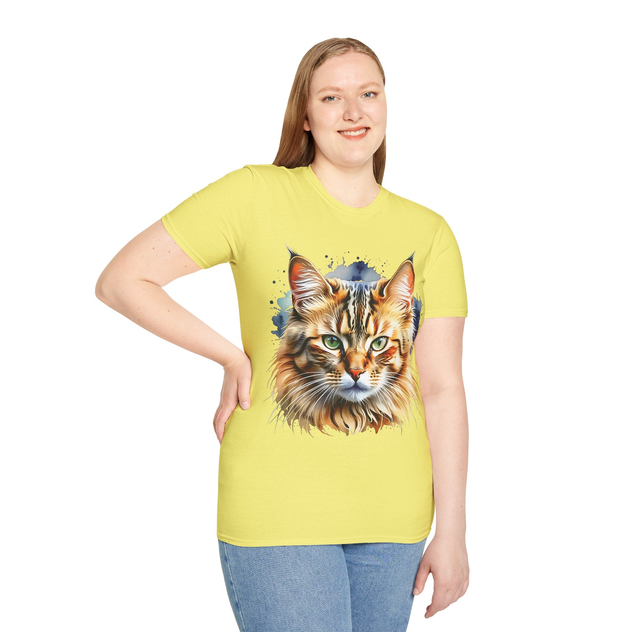 Indulge in the beauty of a Watercolor Cat Head Cotton T-Shirt featuring a vivid, artistically crafted feline portrait. This Unisex T-Shirt introduces warm amber eyes and layered fur tones, creating a unique statement for animal lovers and art enthusiasts. Perfect for everyday wear, it embodies moments of tranquility and companionship. Crafted from 100% ring-spun cotton (153 g/m²), this lightweight shirt offers breathability and comfort. The tubular knit construction maintains a clean silhouette, while the ribbed collar ensures shape retention. Available in sizes S to 3XL.