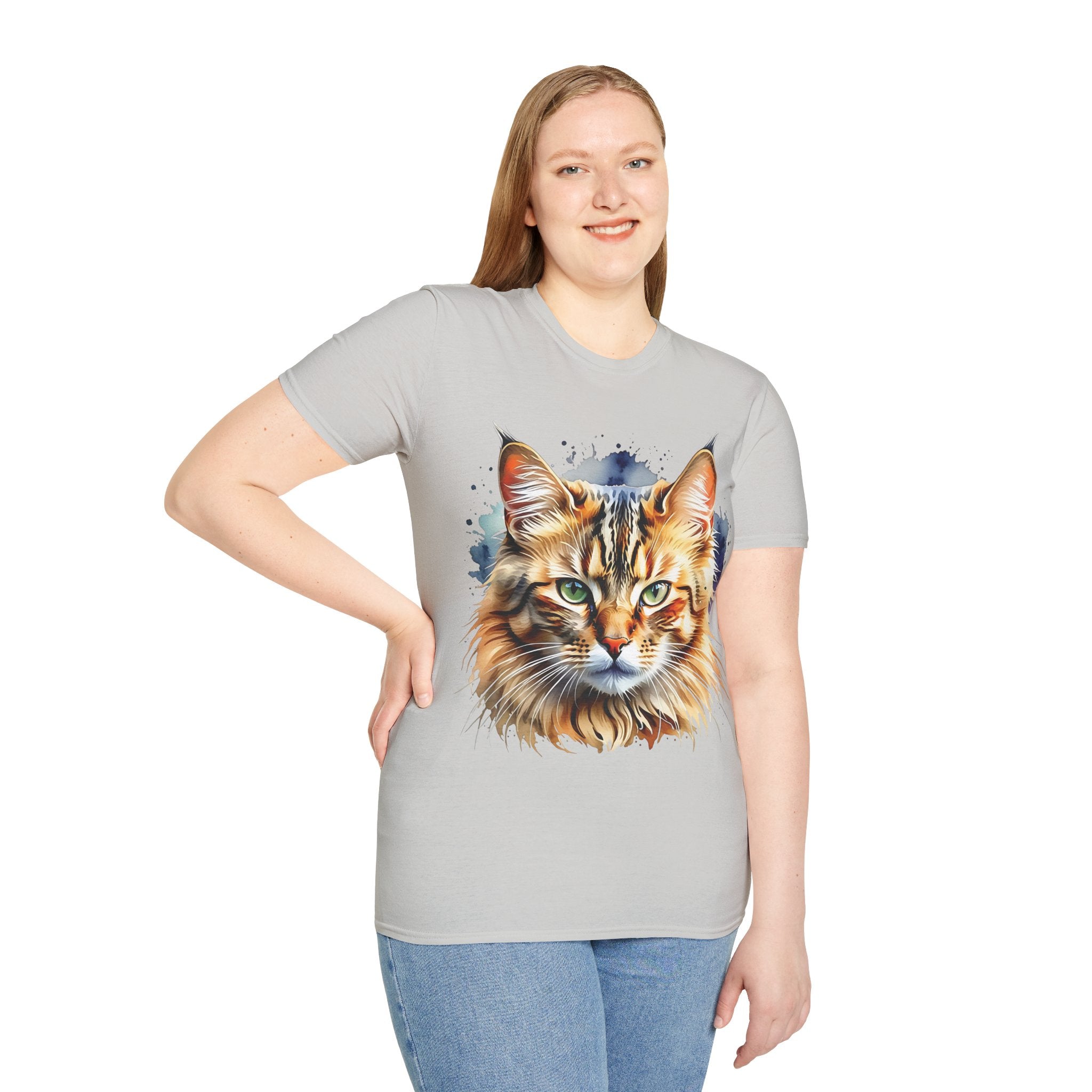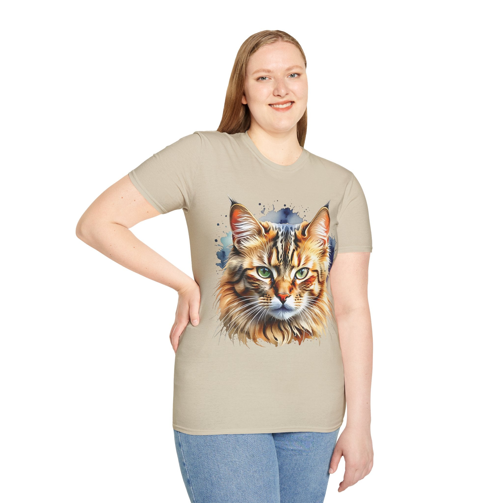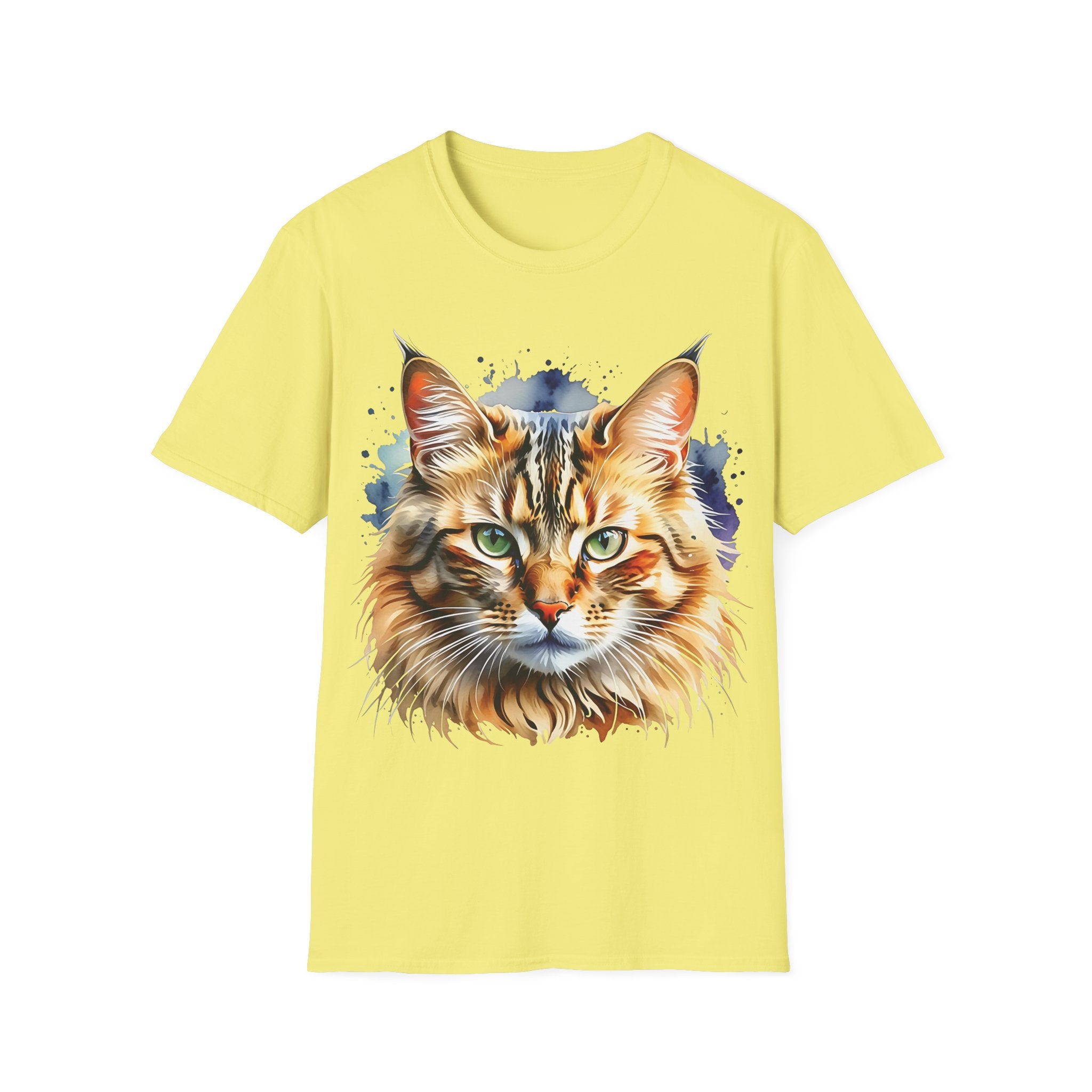 Indulge in the beauty of a Watercolor Cat Head Cotton T-Shirt featuring a vivid, artistically crafted feline portrait. This Unisex T-Shirt introduces warm amber eyes and layered fur tones, creating a unique statement for animal lovers and art enthusiasts. Perfect for everyday wear, it embodies moments of tranquility and companionship. Crafted from 100% ring-spun cotton (153 g/m²), this lightweight shirt offers breathability and comfort. The tubular knit construction maintains a clean silhouette, while the ribbed collar ensures shape retention. Available in sizes S to 3XL.