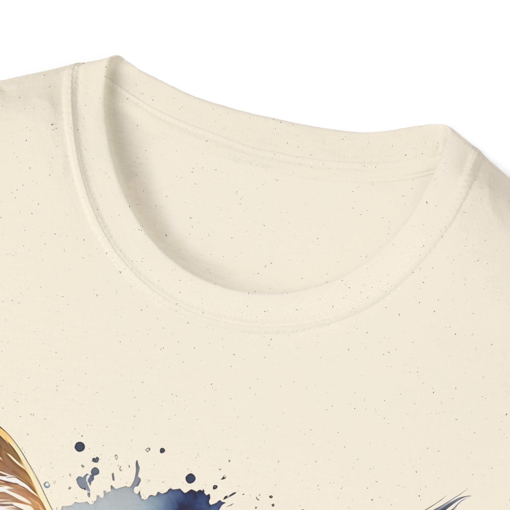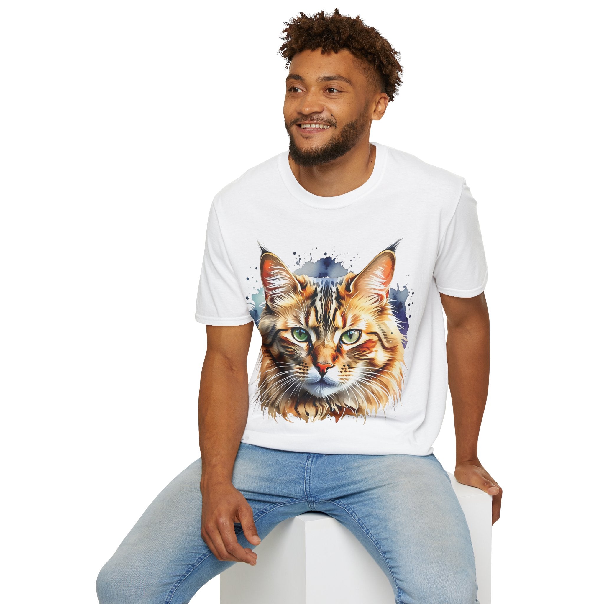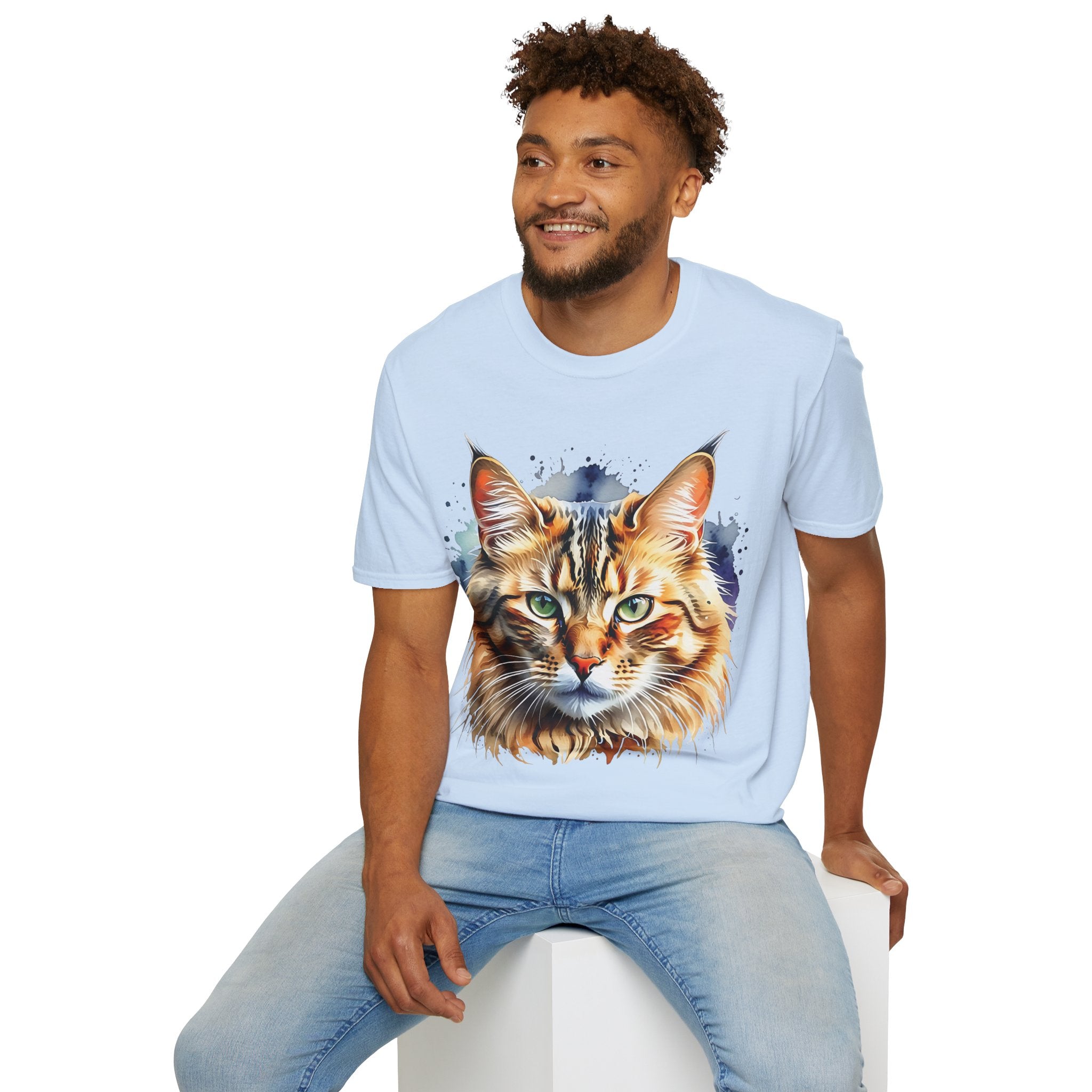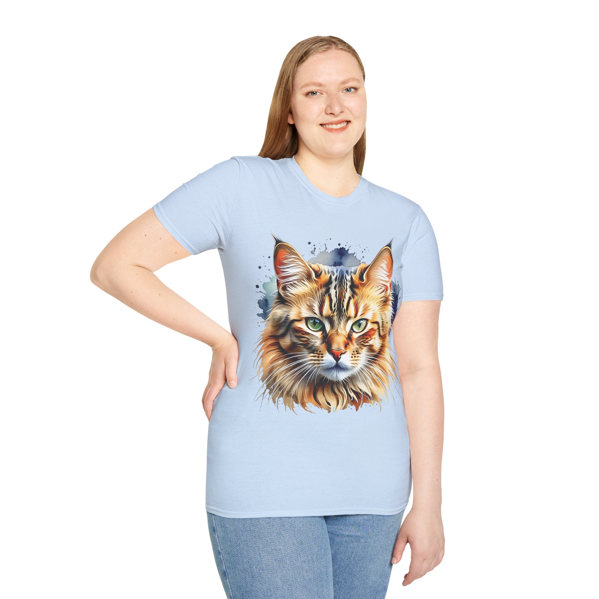 Indulge in the beauty of a Watercolor Cat Head Cotton T-Shirt featuring a vivid, artistically crafted feline portrait. This Unisex T-Shirt introduces warm amber eyes and layered fur tones, creating a unique statement for animal lovers and art enthusiasts. Perfect for everyday wear, it embodies moments of tranquility and companionship. Crafted from 100% ring-spun cotton (153 g/m²), this lightweight shirt offers breathability and comfort. The tubular knit construction maintains a clean silhouette, while the ribbed collar ensures shape retention. Available in sizes S to 3XL.