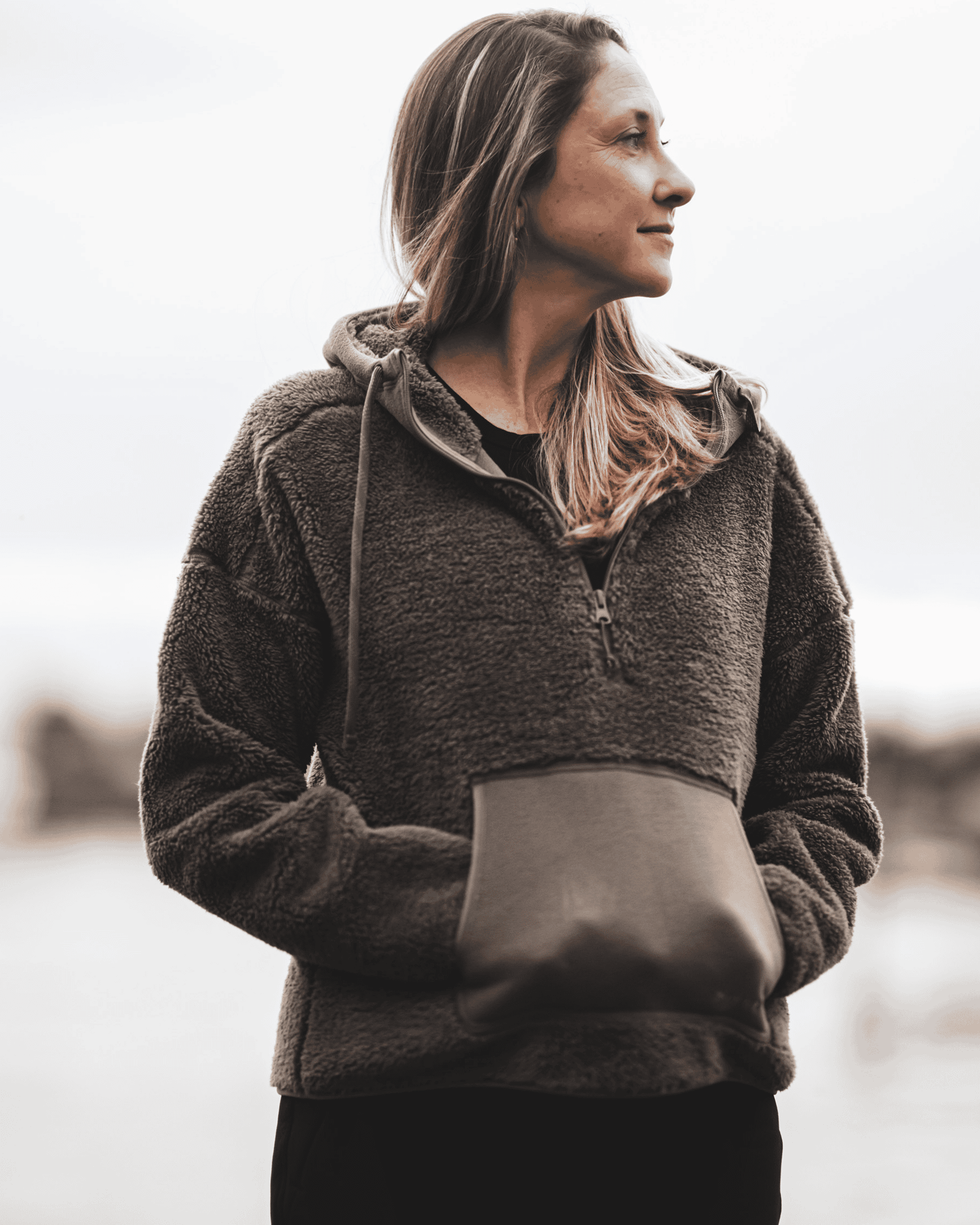 Stay warm and stylish with our Womens Hooded Pullover Fleece. This heavyweight fleece features a 1/2 zip closure, drawcord-adjustable hood, spacious kangaroo pocket, Lycra bound hem and cuffs, and an oversized fit with drop shoulders for a modern look. Made of 65% Polyester and 35% Repreve Polyester, this fleece offers ultimate comfort and longevity. Perfect for handling the chill of fall in cozy comfort.